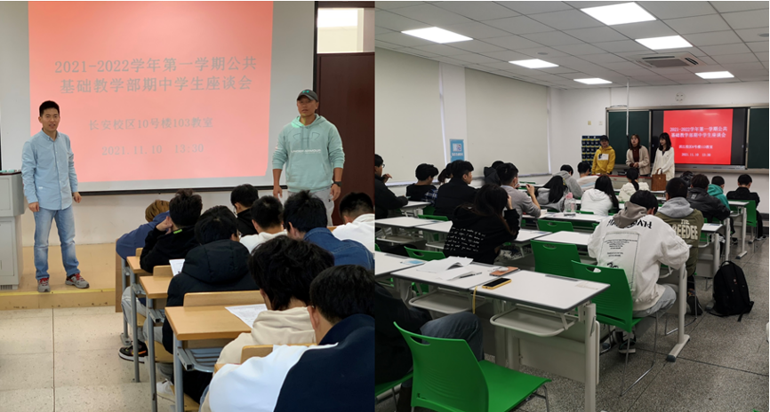 为进一步提高教学水平,2021年11月10日下午,公共基础教学部在滨江、长安两校区同时举行公共基础课期中学生座谈会。座谈会由校督导、部门督导组长王飞主持,公共基础教学部全体督导、教学干事、长安校区2021级新生及滨江校区大二共计100余位学生代表参加。