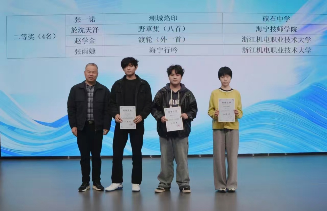 近日,由海宁市文学艺术界联合会主办、海宁市诗词学会承办的“潮乡诗韵 时代新笔”2025海宁市原创诗歌大赛圆满落幕。在大学语文教研室陈锦老师的悉心指导下,我校学子表现卓越,自动化2292赵学金和商数2431张雨婕同学荣获学生组二等奖,机电2301林祥君同学获学生组三等奖,机电2301高斯永同学获学生组优秀奖,陈锦老师本人亦凭借其作品荣获社会组优秀奖,展现了我校师生深厚的人文底蕴与创作活力。